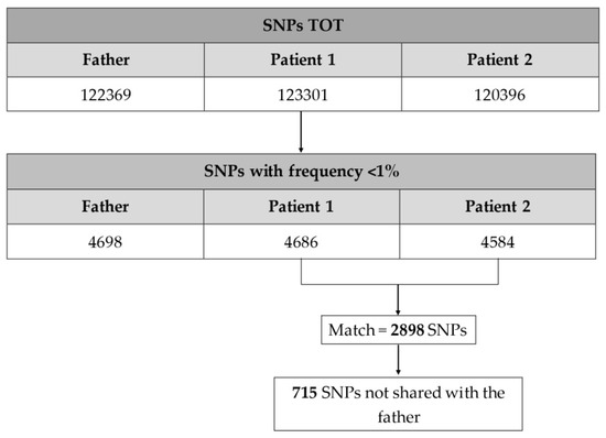 Second, a cross-match comparison between patient 1 and patient 2 SNPs was performed in order to obtain the SNPs shared by the two affected siblings. Therefore, the identified SNPs were compared with the father’s to obtain the variations shared by the two patients, but not in common with their father, as a healthy control (Figure 1).
