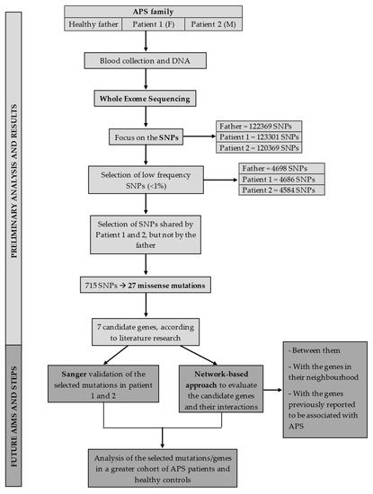 Summarizes the study work-flow and milestone. After the first screenings based on the variants frequency and the literature research of the genes carrying them, the presence of the selected single-nucleotide polymorphisms (SNPs) in patients 1 and 2 will be confirmed using Sanger sequencing. Then, these variants will be investigated in a validation cohort, consisting of 50 antiphospholipid syndrome (APS) patients [25 primary APS (PAPS) and 25 secondary APS (SAPS) patients] and a number of age/sex matched healthy controls in order to assess their frequency in APS. Given the multifactorial nature of this syndrome and the complex interplay within the biological systems, we also performed also a network analysis, using protein–protein interaction tools, to study the interactions between the proteins coded by the genes of interest, between them and their neighborhood, and between them and those coded by genes previously reported to be associated with APS in order to obtain a comprehensive perspective on APS development.