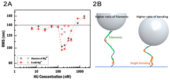 Figure 2. TPM measurements of the effect of MgCl2 on binding of HU to DNA. (A) Root-mean-square (RMS) as a function of HU concentration in the absence (gray) and presence (red) of MgCl2. Open symbols correspond to the smaller subpopulation. The gray horizontal band indicates the RMS of bare DNA in both the absence and presence of MgCl2. Error is the standard error of the mean. (B) Illustration of the nature of heterogeneous complexes. Depending on the ratio between the binding of individual DNA bending proteins and filament formation, the RMS data exhibit one or two populations.