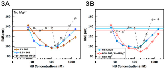 Figure 3. TPM measurements of the effect of blotting grade blocker (BGB) and MgCl2 on the binding of HU to DNA. (A) RMS as a function of HU concentration in different crowding conditions. Horizontal lines represent the RMS of bare DNA in the absence of BGB (gray), 1% BGB (brown), and 0.5% BGB (light blue) in the absence of MgCl2. (B) RMS as a function of HU concentration in different crowding conditions and MgCl2 concentrations. Horizontal lines represent the RMS of bare DNA in the absence of BGB and in the presence of MgCl2 (gray), with 0.5% BGB in the absence of MgCl2 (pink) and with 0.5% BGB in the absence of MgCl2 (light blue). The second population in RMS both in the absence and presence of MgCl2 is removed in (A,B). Error is the standard error of the mean.