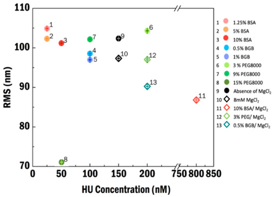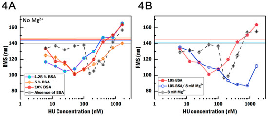 Next, we compare the effects of this crowding agent in the presence of MgCl2. In the presence of MgCl2 and 10% BSA, the most compact state has an RMS of 86.8 ± 0.3 (N = 284) nm at 800 nM, which is a reduction of ≈11% compared to the RMS in presence of MgCl2 without BSA (97.3 ± 0.8 nm, N = 222) (Figure 4B). In addition to the enhanced compaction, the most compacted state occurs at a higher HU concentration. This phenomenon cannot be explained as due to the impact of MgCl2 or BSA alone; BSA together with MgCl2 yields more stable compaction, which is achieved at higher HU concentration. The effect of salt concentration, NaCl, on BSA has been investigated by Yoshikawa et al. [27], who showed that the size of BSA increases in low salt. Thus, in our experiments with MgCl2, BSA could be reduced in size, resulting in a lower effective volume exclusion effect. However, the BSA change in terms of size and surface charge can still possibly inhibit filamentation by interacting with the DNA and thus preventing multiple HU dimers to bind in a filament on DNA.