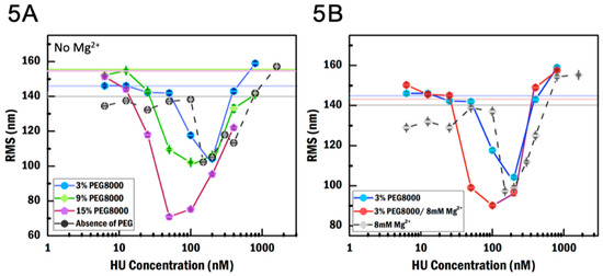 Figure 5. TPM measurements of the effect of PEG8000 and MgCl2 on binding of HU to DNA. (A) RMS as a function of HU concentration in different crowding conditions. Horizontal lines represent the RMS of bare DNA in the absence of PEG8000 (gray), 3% PEG8000 (blue), 9% PEG8000 (green), and 15% PEG8000 (pink) in the absence of MgCl2. (B) RMS as a function of HU concentration in different crowding conditions and MgCl2 concentrations. Horizontal lines represent the RMS of bare DNA in the absence of PEG8000 and in the presence of MgCl2 (gray), with 3% PEG8000 in the absence of MgCl2 (pink) and with 10% BSA in the absence of MgCl2 (light blue). The second population in RMS both in the absence and presence of MgCl2 is removed in (A,B). Error is the standard error of the mean.