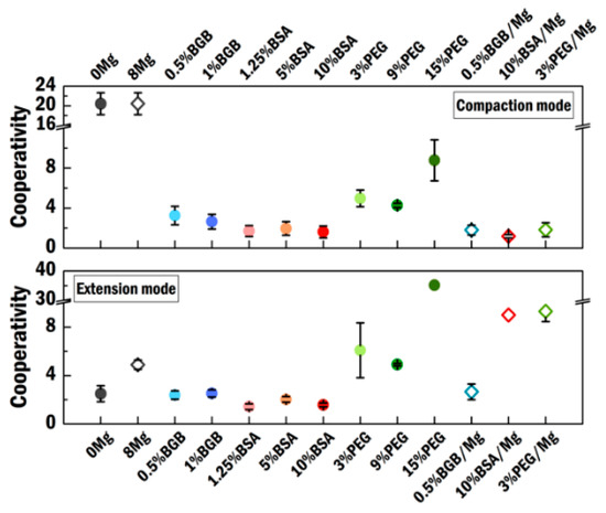 Then, we obtain the cooperativity of HU binding [39] from these coverage data. We extracted this binding parameter by fitting a Hill function [40] to the curves of fractional coverage of DNA as a function of HU concentration. Using the Hill function here is not to pursue an accurate number but rather to facilitate comparison. We divided the binding curves into a compaction regime and an extension regime using the most compact state as the boundary between the two regimes. Next, we analyzed both regimes independently. In both the presence and absence of MgCl2 in crowder-free conditions, the compaction regime exhibits an extremely sharp transition (Figure 2A). It is not possible to obtain a Hill curve fit from the limited number of data points. Therefore, we implement three sets of fitting curves (Figure S6E) as a reference and estimate the cooperativity of HU in the presence and absence of MgCl2 in the compaction regime. The estimated cooperativity is above 20. For 10% BSA in the presence of MgCl2, we obtained the estimated value using the same method due to the limited number of data points (Figure 7, bottom empty diamond). In the presence of nearly all crowding agents, this sharp transition is suppressed, i.e., crowding agents make compaction a less cooperative process. Compared to the low cooperativity in the compaction regime (Figure 7, top), enhanced cooperativity in the extension regime is found in the presence of MgCl2 (Figure 7, bottom).