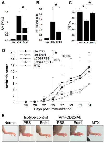 Regulatory T (Treg) cells mediate the therapeutic effects of Erythroid differentiation regulator 1 (Erdr1) on the collagen-induced arthritis (CIA) model. The CIA model was established as described in Materials and Methods. (A) Levels of CII-specific IgM were examined from plasma after 1 week of Erdr1 treatment using ELISA. The population of CD138+ plasma cells (B) or Treg cells (C) in draining lymph nodes from mice treated with Erdr1 for 3 weeks was evaluated by flow cytometric analysis. (D,E) Fourteen days after the first immunization of the CIA model, Treg-depletion antibody or isotype-control antibody was injected (250 mg/mouse), and mice were boosted with 6 h interval. One day after boosting, PBS, Erdr1 (0.1 mg/kg), or methotrexate (MTX, 1 mg/kg) was administered (i.p., 3 times/week) for 3 weeks. Arthritis score (D) and joint swelling (E) were compared from the Treg-depleted CIA mice. Eight mice per group were used for the RA model study. * p < 0.05.