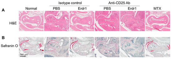 The anti-inflammatory activity and therapeutic effects of Erdr1 on the CIA model have previously been reported [10]. In this study, Erdr1 was confirmed to reduce the plasma levels of bovine type II collagen (CII)-specific IgM, and Erdr1 also downregulated CD138+ plasma cells in draining lymph nodes (Figure 1A,B). Interestingly, Treg cells, which were decreased in CIA mice, were recovered by Erdr1 treatment (Figure 1C), suggesting that Treg cells could mediate the effects of Erdr1 on the improvement of CIA. To examine this hypothesis, a Treg cell depletion assay was performed in the CIA model using anti-CD25 antibody [14]. Erdr1 was treated one day post-depletion, and more than 50% of Treg cells in peripheral lymph nodes were depleted after 48 h from the antibody injection (Supplementary Figure S1). Surprisingly, Erdr1 failed to improve arthritis in Treg-depleted mice, while the disease score was significantly decreased in control antibody-treated mice (Figure 1D,E). In addition, tissue section analyses, including H&E and safranin O stains, revealed that Erdr1 reduced damages of articular cartilage in the CIA model, whereas it had no effect on Treg-depleted CIA mice (Figure 2). These results indicate that Treg cells are involved in the amelioration of CIA by Erdr1.