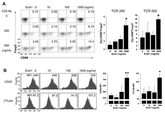 Erdr1 enhances the expression of activation markers in Treg cells. CD4 T cells were isolated from peripheral lymph nodes of DBA1 mice and cultivated with or without Erdr1 in the presence of T cell receptor (TCR) stimuli for 48 h. (A) CD4 T cells were cultured in anti-CD3ε antibody-coated plates (0, 250, 500 ng/mL), and Foxp3+CD69+ cells were evaluated by flow cytometry with CD4+ gating. Results were summarized as mean ± SD from three independent experiments in triplicate (n = 3). (B) CD4 T cells were treated with Erdr1 in the presence of anti-CD3ε antibody (250 ng/mL) for 48 h. The expression levels of the Treg activation markers CD25 and CTLA4 were examined using flow cytometric analysis, and Mean fluorescence intensity (MFI) data were summarized as mean ± SD from three independent experiments in triplicate (n = 3). Cells were gated on CD4+FoxP3+. The numbers indicate the percentages of quadrants in (A) and MFI values in (B), respectively. The flow cytometric results are representative of data from three independent experiments. * p < 0.05, ** p < 0.01 (vs. Erdr1 0 ng/mL).