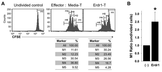 Although Erdr1 induced the expression of activation markers on Treg cells (Figure 3), Foxp3+ non-suppressive T cells have been reported [16], and the regulatory functions of Treg cells can be lost under various conditions [17]. Therefore, it was necessary to confirm whether the Erdr1-treated Treg cells were functionally active. To determine suppressive functions of Erdr1-activated Treg cells, CFSE-labeled responder T cells were co-cultivated with media- or Erdr1-treated T cells, and the proliferation of responder T cells was evaluated in the presence of TCR stimulation. Results revealed that the Erdr1-treated T cells suppressed the proliferation of responder T cells dramatically, and the ratio of the undivided cells (M1 marker) was significantly higher in responders incubated with Erdr1-treated T cells (Figure 4A,B). These data show that Erdr1-activated Treg cells are functionally suppressive.