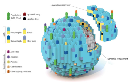 Schematic representation of a variety of liposome drug carriers’ composition, where each component is depicted as a Lego block. The liposomal envelope consists of a lipid bilayer that creates an environment for solubilizing lipophilic drugs. Inside of the liposome is an aquatic core where potential hydrophilic drugs can be entrapped. The block-like nature of this model allows for the easy engrafting of targeting particles (either directly or via polyethylene glycol (PEG)) to the liposomal surface. The modular nature of liposomal components is particularly clear in the case of formulations described in Section 5.