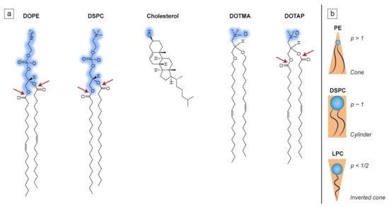 Examples of lipids commonly used in liposomal design. (a) Hydrophilic head groups are marked in blue while ester bonds are marked with the red arrows; (b) simplified representation of the influence of the packing parameter (p = v/al, where v is the molecular volume, a is the cross-sectional area of the head group, and l is the length of the molecule) on the molecular shape of lipids such as phosphatidylethanolamine (PE), 1,2-distearoyl-sn-glycero-3-phosphocholine (DSPC) and lysophosphatidylcholine (LPC). Figure 2b was prepared based on [32].