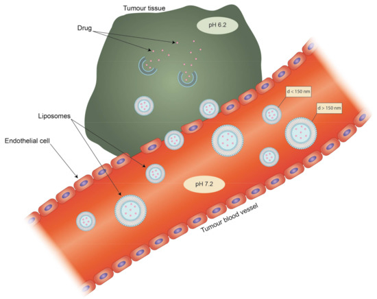 The complementary effect of enhanced permeability and retention effect (EPR) and pH sensitivity of liposomes. Only liposomes with a diameter (d) smaller than 150 nm are able to pass through leaky endothelium cells in blood capillaries into tumor tissue. Blind-ended tumor blood vessels lack lymphatic drainage, thus increasing the accumulation of liposomes.