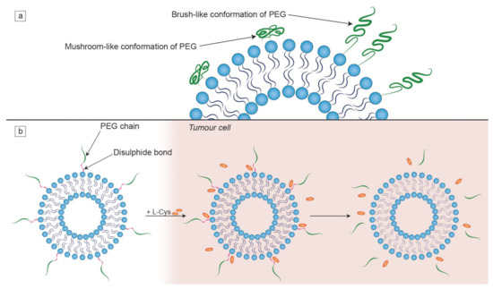 Characteristics of PEG chains on the liposomal surface. (a) The dependence of the PEG chain conformation on its surface density. When PEG chains are engrafted at a higher density, the brush-like conformation is favoured; (b) the mechanism of detachment of PEG chains from a liposome by the L-cysteine (L-Cys) that is found at an elevated concentration in tumor cells. This illustration was developed based on a procedure described in a study by Kuai et al. [122].