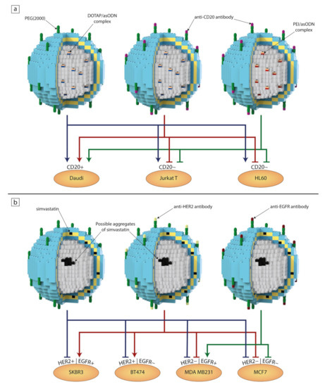 The interchangeability of individual blocks resulting in different or synergistic effects on individual cell lines after treatment with liposomal formulations containing antisense oligonucleotide (asODN) complexes (a) [136,137] and simvastatin (b) [66,138]. Arrows show a noticeable decrease in cell viability and/or interactions with cells, while blind-ended arrows indicate a lack of a significant effect after the addition of liposomes to the cell culture medium.