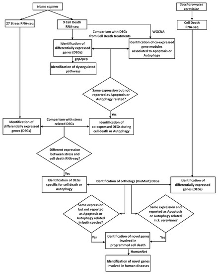 Scheme of the analytical procedure here proposed. Collection of RNA-seq experiments related to cell death (nine cell death RNA-seq) and stress (27 Stress RNA-seq), for Homo sapiens, and related to cell death, for Saccharomyces cerevisiae (cell death RNA-seq), respectively. Differentially-expressed genes (DEGs) obtained from cell-death-related RNA-seq (identification of differentially-expressed genes (DEGs)) were used as for the identification of dysregulated pathways, using gep2pep (identification of dysregulated pathways). Normalized mapped reads related to cell death in H. sapiens were used for the co-expression analysis, using Weighted Correlation Network Analysis (WGCNA) (identification of co-expressed gene modules associated with apoptosis or autophagy). DEGs with the same expression pattern in the nine cell death RNA-seq experiments were compared with modules of co-expressed genes enriched in gene ontologies (GO) or pathways related to apoptosis and/or autophagy. DEGs with the same expression pattern, and not reported as apoptosis- or autophagy-related, were considered (identification of co-expressed DEGs during cell death). Subsequently, these DEGs were compared with stress-related DEGs, to identify DEGs specific to cell death (identification of DEGs specific for cell death). Independently, DEGs related to cell death for S. cerevisiae were also identified. Through the orthology relationships between H. sapiens and S. cerevisiae (downloaded from BioMart), DEGs specific for human cell death were compared with those from S. cerevisiae cell death. This analysis led to the identification of genes involved in cell death with conserved functionalities in the two species (identification of novel genes involved in PCD). Lastly, using HumanNet [43] the genes predicted to be involved in cell death were investigated for their involvement in human diseases (identification of novel genes involved in human diseases).