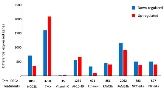 Number of differential expressed genes (DEGs) in H. sapiens cell-death-related RNA-seq experiments. The histogram represents the number of up-regulated (red) and down-regulated (blue) DEGs for each experiment. Numbers in bold represent the total number of DEGs per experiments.