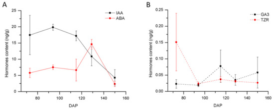 Endogenous levels of ABA, GA3, IAA, and TZR were determined as described by [36]. Freshly harvested seeds (100 mg) at 73, 94, 115, 129, and 150 DAP were ground in liquid nitrogen, and the extraction was performed with acetonitrile solution. The QuEChERS method was used to purify the impurities. The nitrogen purge method was used to concentrate the sample.