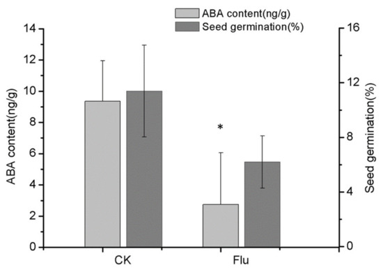 Ninety-four DAP seed capsules were treated with fluridone as previously described [20]. Twenty seed capsules were sprayed with 100 mL fluridone 10 μM, once a week for 1 month. After 30 days, the 124 DAP seeds were collected for germination, and ABA was analyzed as described in Section 4.3 and Section 4.4.