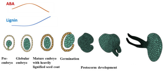 A schematic representation of embryo and protocorm development of P. armeniacum. P. armeniacum embryos developmental arrest at a stage comparable to the globular stage of Arabidopsis embryogenesis without obvious histodifferentiation. Seed coat lignification occurs before germination. Germination gives rise to a tubercle structure called a protocorm, from which the histodifferentiation occurs and the shoot apical meristem subsequently differentiates. The high level of ABA inhibits the germination of immature seeds. Once the lignification rises [25], the ABA level starts to decline.
