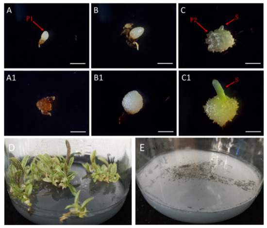 Protocorm and plantlet formation from immature and mature seeds of P. armeniacum. Protocorm was formed from immature seeds harvested at 73 DAP after 60 days cultivation (A), which failed to develop further and turned brownish after 160 days cultivation (A1). Protocorm was formed from immature seeds harvested at 94 DAP after 60 days cultivation (B), which enlarged slowly and failed to develop shoots after 140 days cultivation (B1). Protocorm was formed from mature seeds harvested at 124 DAP after 60 days cultivation (C), which rapidly enlarged and developed a shoot on top after 70 days of cultivation (C1). The plantlet was able to grow properly from mature seeds harvested at 124 DAP (D). The over-mature seeds harvested at 157 DAP failed to germinate due to the physical restriction imposed by lignin accumulation (E). P1: growth-arrested protocorm; P2: properly developed protocorm; S: shoot formed from the top of the protocorm; Scale bar = 0.5 mm.