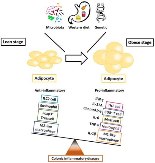 Evidence has demonstrated that excessive adipose tissue accumulation, which is characterized by a chronic inflammatory state involving the activation of pro-inflammatory signaling pathways and increased pro-inflammatory cytokine production [24], increases the risks of developing many chronic diseases, including UC and CD [24,60,61,62,63]. Recent reports have demonstrated a particular role of mesenteric adipose tissue that migrates around intestine, so-called “creeping fat”. The presence of creeping fat, in which the expression of peroxisome proliferator-activated receptor (PPAR)-γ and TNF-α is augmented [64], possesses an association with transmural inflammation, fibrosis, and stricture formation [65], which lead to pathogenic intestinal inflammation in patients with CD [45,66]. Moreover, recent epidemiological analyses have demonstrated the influence of the Western diet on changes in body composition and aggravation of colitis severity in patients with IBD [20]. Thus, both in vitro and in vivo studies and epidemiologic research indicate the potential role in inflammatory colon diseases of adipokine-modulated immune regulation of the interplay between adipose tissue, chronic inflammation, and immune cells (Figure 1). This review focuses on studies that relate immune cells, adipose tissue, and the selected adipokine-modulated production of pro-inflammatory cytokines to immunologic homeostasis in inflammatory colon diseases.
