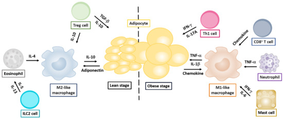 The major contributors to the adipose tissue secretome are tissue-resident immune cells. Accumulating studies have demonstrated distinct differences in the immune cell recruitment around adipocytes and the distinct production and regulation of adipokines in the obese and the lean states. In vivo, these adipose tissue-resident immune cells display plasticity and are able to undergo a phenotypic switch for changes in the local microenvironmental stimuli [57,67]. Neutrophils, one of the first responders of the innate immune response that are recruited to adipose tissue after initiated HFD feeding in vivo, produce TNF-α to inhibit insulin signaling [68]. In the adaptive immune system, adipose tissue-resident macrophages (ATMs) and potentially adipocytes themselves are capable of presenting antigens on the MHC class II complex to T cells or B cells to induce the subsequent adaptive immune response. T cells can be further categorized according to their profile of functional characteristics.