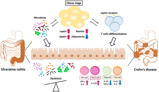 Adipocytes comprise white and brown cells, presumably including diverse intermediate forms. Because white fat cells are the critical part in adipose tissues from adults [51,52], this review focuses on these. Mature white adipocytes consist of a large fat droplet surrounded by a margin of remaining cytoplasm and the nucleus. Adipocytes are characterized by their cellular plasticity, store the body’s energy supplies, and actively secrete various adipokines [53]. Macrophages and T cells are the two most common immune cells present in adipose tissue. Altered infiltration of immune cells and the dysregulated production of pro-inflammatory cytokines have been documented in obesity [41,54,55,56]. For example, adipose tissue-resident T cells increase approximately threefold in the high-fat diet (HFD) mouse model of obesity [57]. The adipokines comprise a group of mediators secreted by adipose tissue, including adiponectin, leptin, apelin, and resistin. Recent evidence indicates that adipokines can modulate immune functions in addition to their regulation of metabolic homeostasis within adipose tissue [25,58]. For example, previous studies have demonstrated that adiponectin can suppress the phagocytic activity of mature macrophages mediated by the complement C1q receptor and inhibit TNF-α production stimulated by lipopolysaccharide (LPS) [36]. In addition, leptin has been reported to be a T-cell immune response modulator that can enhance the cytotoxicity of natural killer (NK) cells, induce activation of granulocytes, macrophages and dendritic cells, and polarize Th cell subsets differentiation toward a pro-inflammatory Th1 phenotype rather than an anti-inflammatory Th2 phenotype [37,59]. Thus, investigation of the adipokine modulation of immune responses as a potential therapeutic target to modulate inflammation in the context of the pathophysiology of IBD may be a focus of future research in inflammatory colon diseases.