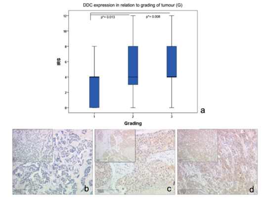 DDC protein expression in breast cancer cells according to tumor grading. (a) Boxplot of DDC protein expression in breast cancer according to their grading (* significant p-value), (b) DDC staining in breast cancer (grading 1) with IRS = 2, 10× and 25× magnification, (c) DDC staining in breast cancer (G2) with IRS = 4, 10× and 25× magnification, (d) DDC staining in breast cancer (G3) with IRS = 6, 10× and 25× magnification.
