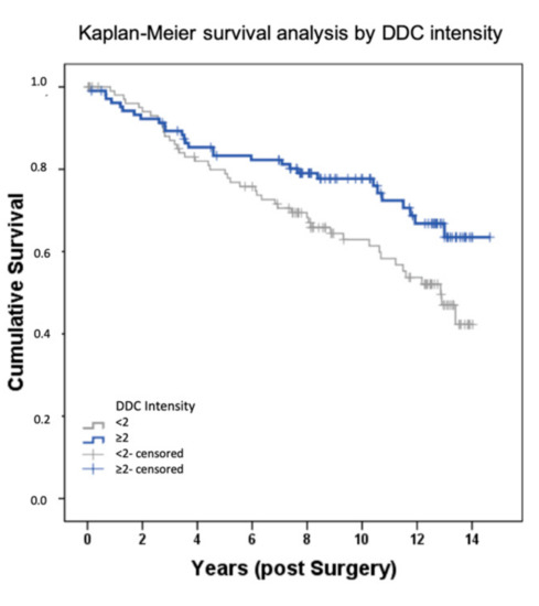 Influence of DDC expression on overall survival (OS) of patients with early breast cancer. Kaplan–Meier curve showing the association between an increased DDC expression (Intensity ≥ 2, n = 109; Intensity < 2, n = 126) and a longer overall survival (p = 0.03).