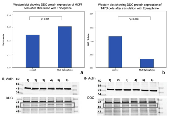 Western Blot analysis of DDC protein expression in MCF7 and T47D cells after stimulation with epinephrine. (a) Bar chart of DDC expression in MCF7 cells after incubation with 10 µM epinephrine. Epinephrine led to an increase of DDC protein expression (p = 0.051) that was not significant. 1)–6) Western blot membranes after incubation with ß-actin and DDC antibodies (marked with gray box). 1) 3) 5): control samples. 2) 4) 6): stimulated samples with 10 µM epinephrine. (b) Bar chart of DDC expression in T47D cells after incubation with 10 µM epinephrine (* significant p-value). Epinephrine induced a significant downregulation of DDC protein expression (p = 0.038). 1)–6) show Western blot membranes after incubation with ß-actin and DDC antibodies (marked with a gray box). 1) 3) 5): control samples. 2) 4) 6): stimulated samples with 10 µM epinephrine.