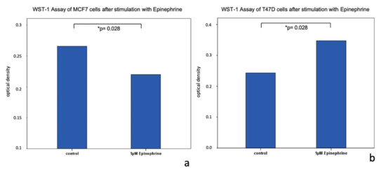 WST-1 assay of MCF7 and T47D cells stimulated with epinephrine. (a) Bar chart of optical density of MCF7 cells after incubation with 1 µM epinephrine for 48 h. Epinephrine induced a decrease of cell proliferation (p = 0.028; * significant p-value). (b) Bar chart of optical density of T47D cells after incubation with 1 µM epinephrine for 48 h. Epinephrine induced an increase of cell proliferation (p = 0.028; * significant p-value).