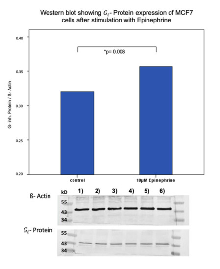 - protein expression in MCF7 cells after stimulation with epinephrine. Bar chart of - protein expression in MCF7 cells after incubation with 10 µM epinephrine. Epinephrine induced a significant upregulation of - protein expression (p = 0.008; * significant p-value). 1)–6) Western blot membranes after incubation with ß-actin and - protein antibodies. 1) 3) 5): control samples. 2) 4) 6): stimulated samples with 10 µM epinephrine (Figure S1).