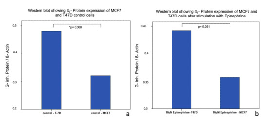 Incubation of T47D cells with 10 μM epinephrine for 6 h induced no significant difference in - protein expression (p = 0.859). In contrast, MCF7 cells showed a significant change in - protein expression. After an incubation with 10 μM epinephrine for 6 h, a significant upregulation of - protein expression was observed (p = 0.008) (Figure 6). Furthermore, unstimulated MCF7 and T47D cells differed in their total expression of - protein. MCF7 unstimulated cells expressed significantly less - protein than unstimulated T47D cells (p = 0.008) (Figure 7). A trend of enhanced - protein expression (p = 0.051) could be observed between MCF7 and T47D stimulated cells (Figure 7).