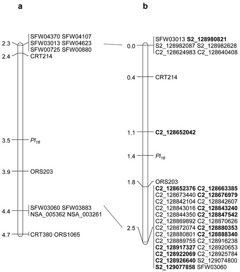 Pl18 genetic maps. (a) Pl18 basic map [7]; (b) Pl18 saturation map. The diagnostic markers for Pl18 are shown in bold.