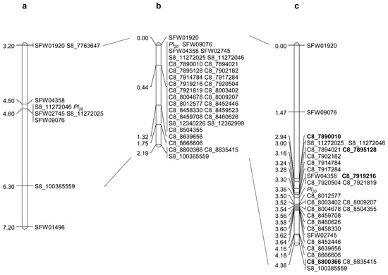Pl20 genetic maps. (a) Pl20 basic map [1]; (b) Pl20 saturation map; (c) Pl20 fine map. The diagnostic markers for Pl20 are shown in bold.
