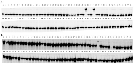 The polymerase chain reaction (PCR) amplification pattern of 96 selected sunflower lines with Pl18 and Pl20 diagnostic single nucleotide polymorphism (SNP) markers. The names and pedigrees of 96 selected sunflower lines (lanes) are listed in Supplementary Table S2. (a) PCR amplification pattern with SNP marker C2_128922069 diagnostic for Pl18. Lane 31: HA-DM1, and lane 34: HA-DM4, both have the Pl18 gene and show the Pl18 marker allele. (b) PCR amplification pattern with SNP marker C8_7895128 diagnostic for Pl20. Lane 36: HA-DM7 with the Pl20 gene.