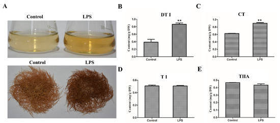 Lipopolysaccharide (LPS) enhances tanshinone accumulation in the wild type (WT) hairy roots of S. miltiorrhiza. (A) LPS-treated WT hairy roots of S. miltiorrhiza. The hairy roots were treated by 50 μg/mL LPS for 10 days. H2O was used as a control. (B–E) The content of tanshinones in LPS-treated hairy roots. The content of the tanshinones was analyzed by HPLC and presented by the means ± SD. The significant differences between different groups were calculated by the Student’s t-test. (**) indicates a very significant difference (p ≤ 0.01). TI, tanshinone I; TIIA, tanshinone IIA; CT, cryptotanshinone; DT, dihydrotanshinone.