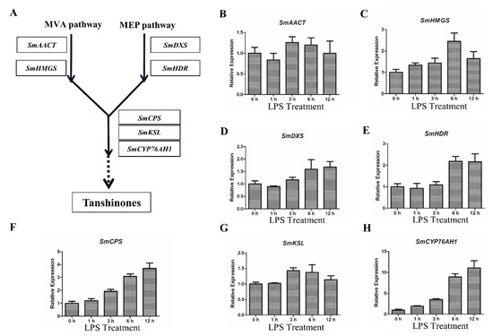 To elucidate the regulation mechanism of LPS, the key biosynthesis genes of tanshinones were analyzed by qRT-PCR. In the biosynthesis pathways of tanshinones, SmAACT and SmHMGS are from the MVA pathway, and SmDXS and SmHDR are from the MEP pathway (Figure 2A). After being induced by LPS, the transcripts levels of SmAACT and SmHMGS were obviously upregulated at 6 h (Figure 2B,C). Similarly, SmDXS and SmHDR showed the same response to LPS treatment (Figure 2D,E). In the confirmed biosynthesis pathway of tanshinones, SmCPS, SmKSL and SmCYP76AH1 are located downstream the MVA and MEP pathways (Figure 2A). Notably, the expression of these three genes also increased along with LPS treatment (Figure 2F–H). SmCPS and SmCYP76AH1 were especially upregulated by LPS in a time-dependent manner (Figure 2F,H).