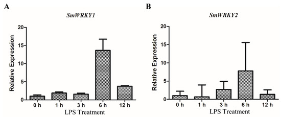 To further explore the stimulation mechanism of these biosynthesis genes by LPS, the expression of transcription factors SmWRKY1 and SmWRKY2 was analyzed by qRT-PCR. In S. miltiorrhiza, SmWRKY1 can bind with the promoter of SmDXR, and SmWRKY2 can bind with SmDXS and SmCPS, to positively regulate tanshinone biosynthesis [5,17,18]. Our further analysis indicated that LPS upregulated the transcript levels of SmWRKY1 and SmWRKY2 in the same time-dependent manner. The expression of these transcription factors responded to LPS and reached a peak at 6 h (Figure 3A,B). Hence, SmDXS, SmCPS and SmDXR can be highly transcribed due to the activation of SmWRKY1 and SmWRKY2.