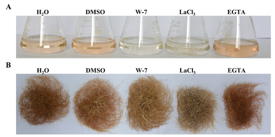 Ca2+ signal transduction is essential for the LPS-triggered plant immune response [15]. Thus, three Ca2+ signal inhibitors, including Ca2+ channel blocker LaCl3, CaM antagonist W-7 and Ca2+ chelator EGTA, were applied to analyze the role of Ca2+ signaling in tanshinone biosynthesis [15,19]. Since tanshinones can generate a deep red color in the roots of S. miltiorrhiza, we preliminarily observed the color of the hairy roots treated by different Ca2+ reagents. As shown in Figure 4A,B, the hairy roots treated by 1 mmol/L LaCl3 apparently showed a light color compared to the H2O control. Similarly, 100 μmol/L W-7 also led to light color in contrast to the DMSO control. Nevertheless, 1mmol/L EGTA did not obviously affect the color of the hairy roots compared to the H2O control. These results suggest that Ca2+ signaling is closely associated with tanshinone biosynthesis. The accumulation of tanshinones might be inhibited by blocking Ca2+ influx or repressing CaM-mediated signaling in the hairy roots of S. miltiorrhiza.