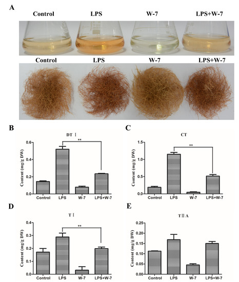W-7 affects tanshinone accumulation in the WT hairy roots of S. miltiorrhiza. (A) The cultures of treated hairy roots. The WT hairy roots were treated by 50 μg/mL LPS, 100 μmol/L W-7 and 50 μg/mL LPS + 100 μmol/L W-7 for 10 days, DMSO was used as a control. (B–E) The content of tanshinones in treated hairy roots. The content of tanshinones in DMSO, LPS, W-7 and LPS+W-7 treated hairy roots was analyzed by HPLC. The bars are shown as the means ± SD. The significant differences between different groups were calculated by the Student’s t-test. (**) indicates a very significant difference (p ≤ 0.01).