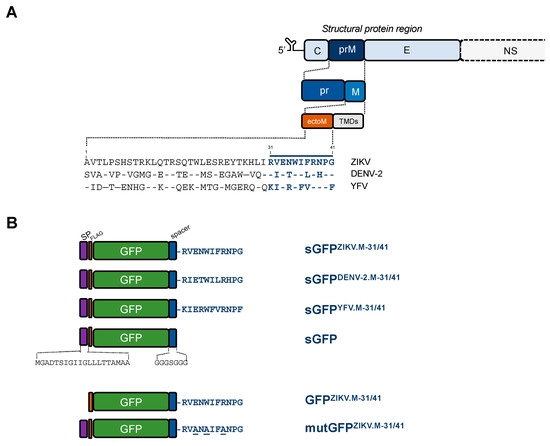 Schematic representation of the GFP-M oligopeptide constructs. In (A), a schematic representation of mature prM protein that is structured into a “pr” polypeptide followed by the residues M-1/41 which compose the M ectodomain and ending in a transmembrane anchoring region with two transmembrane domains (TMDs). The residues M-1/41 of epidemic Brazilian ZIKV strain BeH819015, epidemic La Reunion 2018 DENV-2 strain RUJul and YFV 17D vaccine strain are listed. The last C-terminal residues of flavivirus M ectodomain are underlined. In (B), the GFP constructs are preceded at the N-terminus by the signal peptide (SP) of ZIKV prM protein followed by a FLAG epitope. The soluble sGFP-M oligopeptide constructs are ended by a glycine−serine spacer followed by the residues M-31/41 of ZIKV, DENV-2 or YFV. The sGFP construct is restricted to a glycine−serine spacer at its C-terminus. The GFPZIKV.M-31/41 construct is a mutant lacking in prM signal peptide. The mutGFPZIKV.M-31/41 construct was made by replacing the residues M-E33/W35/R38 with alanine. The three Ala mutations in mutGFPZIKV.M-31/41 are underlined.