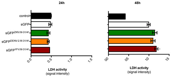To determine whether expression of sGFP proteins carrying the different M oligopeptides has an effect on cell membrane integrity, Huh7 cells were transfected with vector plasmids expressing either sGFPZIKV.M-31/41, sGFPDENV-2.M-31/41, or sGFPYFV.M-31/41 (Figure 2). The sGFP construct was used as a control. Cell membrane integrity was evaluated by measuring lactate dehydogenase (LDH) release (Figure 2). At 24 h post-transfection, no significant change in LDH activity was observed in transfected Huh7 cells whatever the recombinant GFP constructs tested. At 48 h post-transfection, LDH activity increased in Huh7 cells expressing the sGFP constructs as compared to control (Figure 2). Only the sGFPYFV.M-31/41 construct was slightly more cytotoxic compared to other sGFP constructs. From these results, it has been estimated that 24 h was the more appropriate time-point of transfection to assess the death-promoting capability of sGFP constructs with the flavivirus M oligopeptides in Huh7 cells.