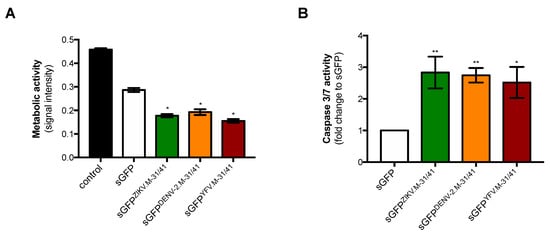 Expression of sGFP-M31/41 constructs affects cell viability. Huh7 cells were transfected 24 h with plasmids coding for sGFPZIKV.M-31/41, sGFPDENV-2.M-31/41, or sGFPYFV.M-31/41 or mock-transfected (control). The sGFP plasmid construct served as a control. In (A), the level of cell metabolic activity was measured using MTT assay and expressed as signal intensity (O.D.). The results are the mean (±SEM) of six independent assays. Statistical analysis for comparing sGFP-M constructs with sGFP was performed and noted (* p < 0.0001). In (B), Caspase 3/7 enzymatic activity was expressed as the fold change of caspase enzymatic activity in assay relative to sGFP. The results are the mean (±SEM) of six independent assays. Statistical analysis for comparing sGFP-M constructs with sGFP was performed and noted (** p < 0.001; * p < 0.01).