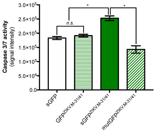 Caspase-associated apoptosis activation requires the signal peptide of sGFPZIKV.M-31/41 and involves the residues M-E33/W35/R38. Huh7 cells were transfected 24 h with plasmids expressing sGFPZIKV.M-31/41 or its mutants lacking a signal peptide (GFPZIKV.M-31/41) or bearing the Ala residues at positions M-33/35/38 (mutGFPZIKV.M-31/41). The sGFP plasmid construct served as a control. Caspase 3/7 enzymatic activity was measured using a caspase-3/7 assay kit, and the O.D. values were expressed as signal intensity. The results are the mean (±SEM) of three independent experiments. Statistical analysis for comparing sGFP-M constructs with sGFP was performed and noted (* p < 0.0001; n.s.: nonsignificant).