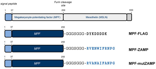 We wondered whether association of ZIKV residues M-31/41 to a human tumor-associated antigen could trigger caspase-associated apoptosis. Mesothelin (MSLN, 630 amino-acid residues) is a tumor-associated antigen which is overexpressed in many human cancers [8]. The megakaryocyte-potentiating factor (MPF, 250 amino-acid residues) is a N-terminal cleavage product from preprotein MSLN [9] (Figure 5). As a human tumor antigen, soluble MPF is released into the circulation serving as a biomarker for the prognosis of lung cancers. The oligopeptide RVENWIFRNPG (hereafter referred to as ZAMP for Zika Apoptosis M Peptide) representing the ZIKV M-31/41 residues was joined to the C-terminus of MPF (Figure 5). The gene coding for human MPF ended by a glycine−serine spacer and ZAMP was inserted into pcDNA3 plasmid. The authentic signal peptide of MPF was used for translocation of MPF-ZAMP into the secretory pathway. A recombinant MPF protein tagged with a FLAG epitope in place of ZAMP was used as a control (Figure 5). Given that the death-promoting activity of mutZAMP had been lost due to mutations on residues M-33/35/28 (Figure 4), a MPF-mutZAMP mutant was made by replacing the residues M-E33/W35/R38 of ZAMP with alanine (Figure 5).