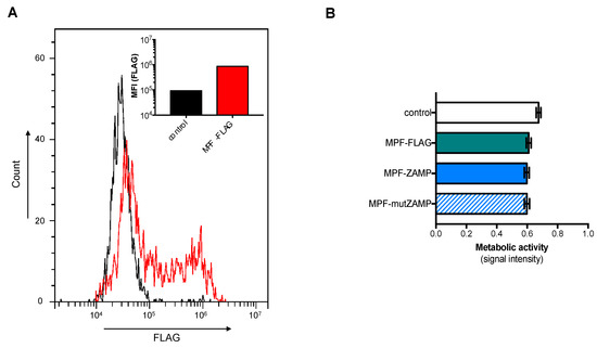 To validate the expression of our recombinant MPF in human cells, human embryonic kidney HEK-293T cells were transfected with a plasmid expressing MPF-FLAG protein. FACS analysis detected a high expression level of MPF-FLAG in HEK-293T cells using anti-FLAG antibody (Figure 6A). The effects of MPF-ZAMP expression on cell viability were examined by measuring MTT activity. At 48 h post-transfection, there was no change in metabolic activity of HEK-293T cells expressing MPF-ZAMP or MPF-mutZAMP as compared to MPF-FLAG (Figure 6B). Thus, expression of a recombinant MPF bearing ZAMP or its defective mutant had no effect on the viability of HEK-293T cells. The absence of sensitivity of HEK-293T cells to ZAMP expression is consistent with a previous report on a lack of proapoptotic activity of DENV ApoptoM in these cells [6].