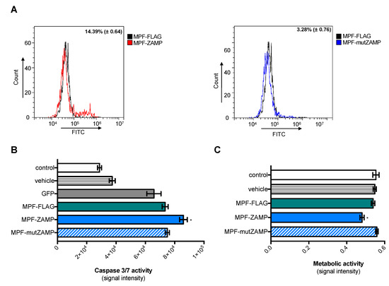 The following are available online at https://www.mdpi.com/1422-0067/21/24/9578/s1, Figure S1: Expression of sGFP constructs in transfected Huh7 cells. Figure S2: Expression of MPF-FLAG construct in A549 cells; Figure S3: Caspase-3/7 enzymatic activity in A549 cells expressing MPF-mutZAMP mutant.