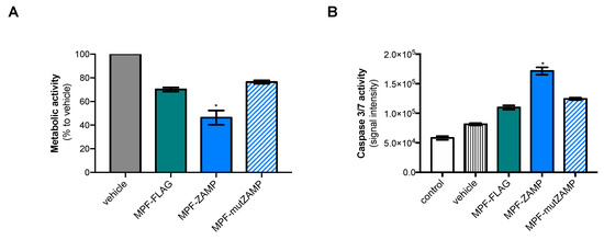 We wondered whether MPF-ZAMP could trigger apoptosis in human hepatoma cells such as Huh7 cells. A MTT assay showed that expression of MPF-ZAMP resulted in a dramatic loss of metabolic activity in Huh7 cells at 24 h post-transfection. Consequently, the impact of MPF-ZAMP expression on the level of cell metabolism activity was examined at 18 h post-transfection. At this timepoint of transfection, the level of metabolic activity was significantly reduced in Huh7 cells expressing MPF-ZAMP as compared to MPF-FLAG or MPF-mutZAMP (Figure 8A). The effect of MPF-ZAMP on cellular metabolism coincided with a high level of caspase-3/7 enzymatic activity in Huh7 cells (Figure 8B). At 24 h post-transfection, a comparable level of caspase-3/7 activation was detected in Huh7 cells expressing MPF-mutZAMP or MPF-FLAG. There was a lack of proapoptotic activity for the ZAMP mutant bearing the Ala mutations (Figure S3). We can conclude that expression of MPF-ZAMP induces caspase-associated apoptosis activation in Huh7 cells as it has been observed with A549 cells.