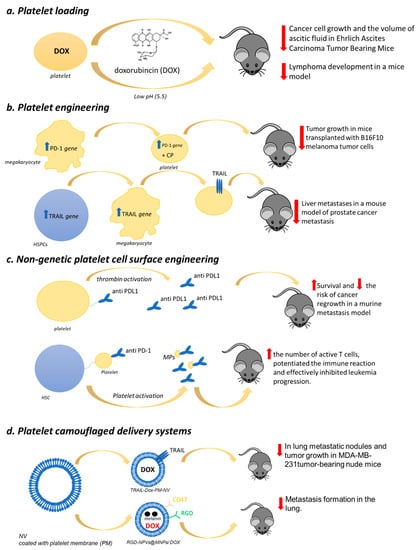 Platelet-based drug delivery systems. Four different types are categorized: (a) Platelet loading; (b) platelet engineering; (c) nongenetic platelet cell surface engineering; (d) platelet camouflaged delivery systems. Their antitumoral effects in in vivo models are also reported.