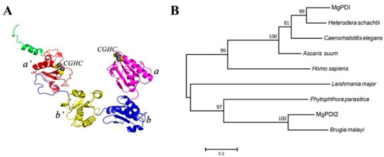 Sequence analysis of MgPDI2. (A) The tertiary structure of MgPDI2. (B) Molecular phylogenetic analysis of protein disulfide isomerase (PDI) proteins from different organisms based on PDI-deduced amino acid sequences. The numbers indicated on the nodes are the bootstrap values for each cluster based on 1000 permutations.