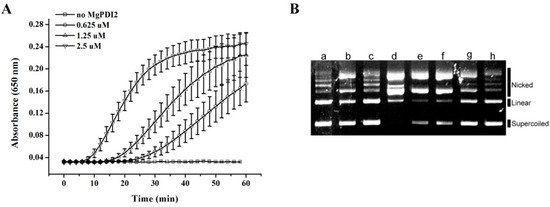 The ability of MgPDI2 to protect DNA from oxidative damage was determined by the method used by Tian et al. [19]. Briefly, the mixed-function oxidase (MFO) system, consisting of 1.65 mM DTT, 16.5 mM FeCl3, and different concentrations of MgPDI2 (from 0.1 to 100 µg/mL) were pre-incubated at 37 °C for 2.5 h. pGEM-T easy plasmid DNA (500 ng, Promega, Madison, WI, USA) was then added and incubated for 1 h at 37 °C. Nicking of DNA was evaluated by ethidium bromide staining after electrophoresis separation in 0.8% agarose gels [35,36].